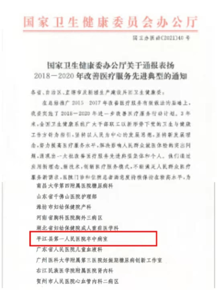 近日,国家卫生健康委员会办公厅公布《关于通报表扬2018—2020年改善医疗服务先进典型的通知》(国卫办医函[2021]40号),县第一人民医院卒中病室荣获改善医疗服务先进典型——“以人文服务为媒介,构建和谐医患关系”先进科室荣誉称号!
