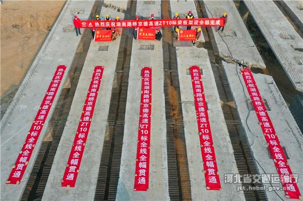 除此之外,京德高速ZT9标完成3052片预制T梁架设任务,ZT10标完成2585片梁板架设,均实现全线全幅贯通。