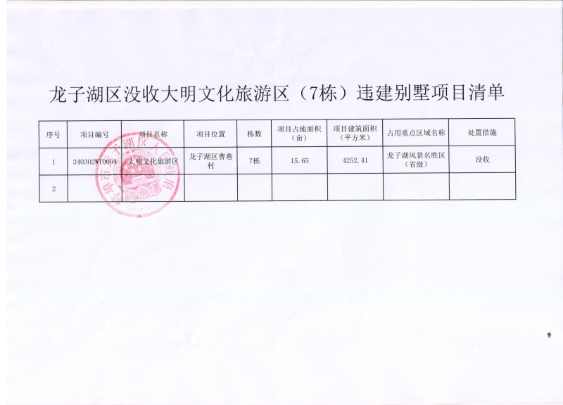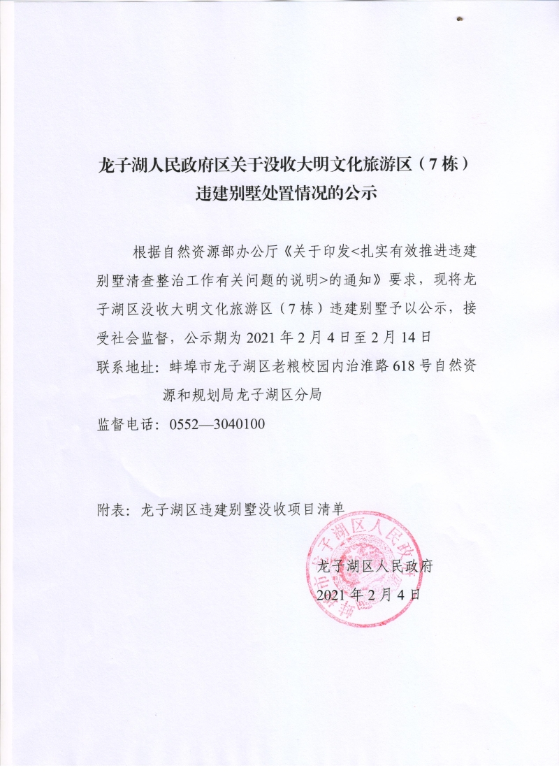 龙子湖区人民政府关于没收大明文化旅游区(7栋)违建别墅处置情况的公示