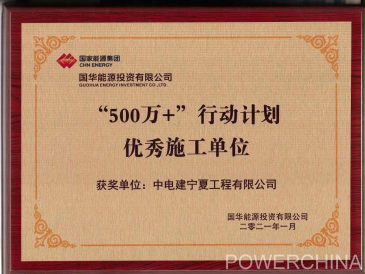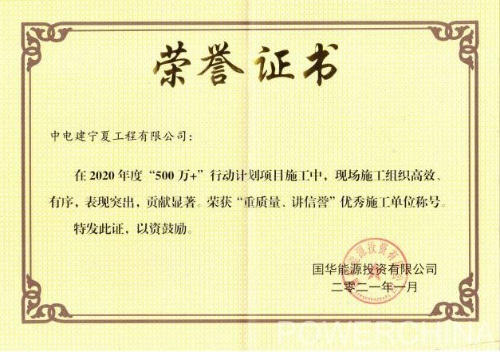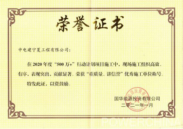 日前,公司收到国华能源投资有限公司奖牌和荣誉证书,表彰宁夏电建在2020年度“500+”行动计划项目实施中,现场施工组织高效有序,表现突出,贡献显著,荣获“重质量、讲信誉”优秀施工单位称号。