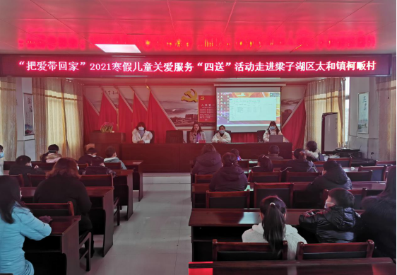 (本网讯)为使我区广大青少年、儿童度过一个健康、安全、温暖、幸福、充满爱的寒假,按照全国、省、市妇联《关于开展“把爱带回家”2021寒假儿童关爱服务“四送”活动的通知》,和当前新冠肺炎疫情防控要求,梁子湖区妇联组织家庭教育指导服务中心于2021年2月2日上午9点在太和镇柯畈村开展2021年寒假“把爱带回家”儿童关爱服务“四送”活动。