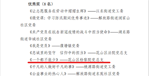 在全区首届党员教育微视频观摩评比活动中,花山区检察院紧扣主题、结合实际,积极制作报送了一批作品,其中《一个都不能少》荣获优秀奖。