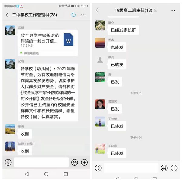 固镇二中利用微信群等方式积极宣传《致全县学生家长防范诈骗的一封公开信》