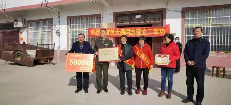 在单大磊家所在的村,街坊邻居都纷纷为村里有这样的英雄人物而感到骄傲。随后,张高龙同志宣读单大磊同志荣立二等功的喜报,并将喜报递到单大磊同志的父母手里。陈学平同志向他们颁发“二等功臣之家”牌匾,并送去五万元优待慰问金。