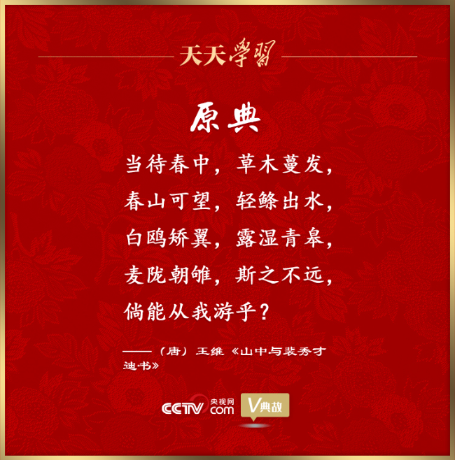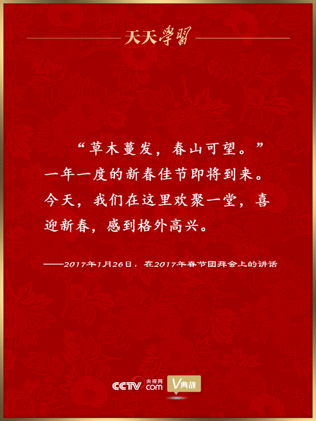 党的十八大以来,习近平总书记多次在腊月二十九举行的春节团拜会上发表重要讲话,盘点旧岁、谋划新年,向全国各族人民、港澳台同胞和海外侨胞拜年,并致以美好的新春祝福。在讲话中,习近平总书记频频引用具有新春节令特点的古代经典诗文名句抒发情怀、畅想未来。这些诗文名句如春风化雨润人心田、暖人心扉,激励着亿万人民在新的一年里追梦前行。