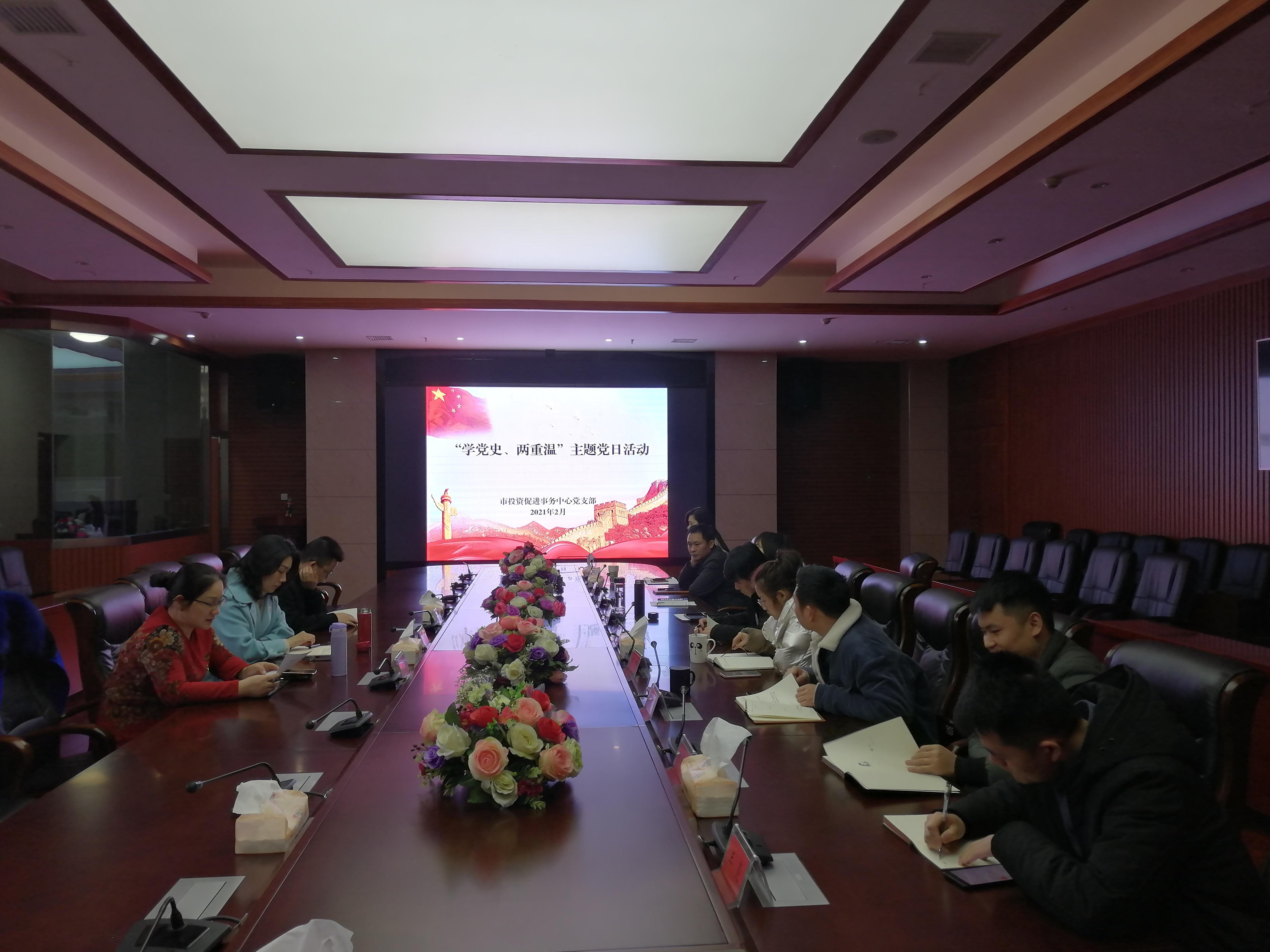 2月26日下午,市投资促进事务中心在230会议室组织召开“学党史、两重温”主题党日活动,会议由副主任丁洁主持,全体党员、发展对象、群众代表参加。