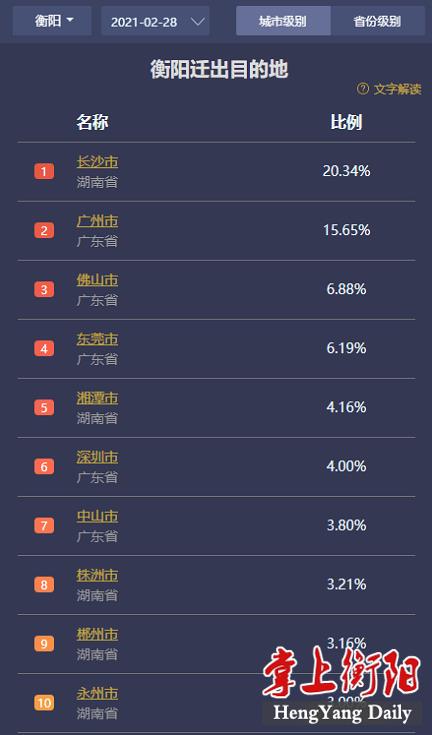 2月17日(正月初六)起,我市开始了大规模务工返程高峰,从外流入衡阳的人员主要在集中在湖南、湖北、广东、广西、浙江、江西等地,衡阳外出人员同样集中在省内和广东两地。以2月28日为例,衡阳迁出目的地前十名的城市分别为长沙市(20.34%)、广州市(15.65%)、佛山市(6.88%)、东莞市(6.19%)、湘潭市(4.16%)、深圳市(4.00%)、中山市(3.80%)、株洲市(3.21%)、郴州市(3.16%)、永州市(3.00%)。由此不难看出,衡阳“打工人”更喜欢在省内和广东就业。