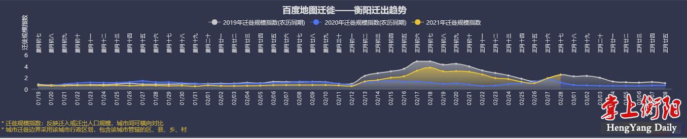 2021年春运已近尾声,百度地图大数据显示,今年在就地过年政策的影响下,本市春运迁移规模虽较去年有所下降,但整体保持平稳状态。自1月27日(腊月二十五)起,我市迎来大规模返乡潮,从外流入衡阳的人员主要在集中在广东、湖南、浙江、广西等地,衡阳外出人员主要集中在省内和广东两地。2月3日,流入衡阳的人口主要来源城市是广州市、长沙市、东莞市、深圳市、佛山市,其中广东省占比超过50%。