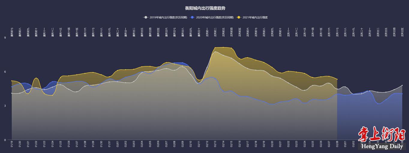 另外,记者翻阅《衡阳城内出行强度趋势》大数据发现,我市城内由于机动车数量不断增长,出行强度过于往年。今年春运期间,衡阳市出行高峰从腊月十二开始激增,除大年三十当日快速回落外,一直保持高位运行,在正月初二、正月初三、正月初四达到顶峰,然后快速回落,直至正月十四恢复平稳。