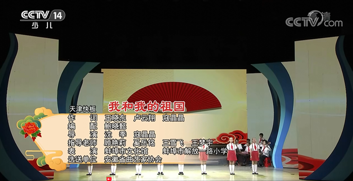 由蚌埠市文化馆、蚌埠市解放一路小学演出的原创作品天津快板《我和我的祖国》于3月1日晚9点荣登央视少儿频道《大手牵小手》栏目。
