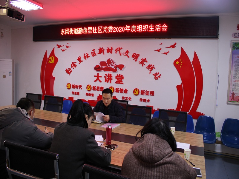 2021年2月26日上午,按照东风街道党工委有关要求,在街道党工委的精心指导下,严格按照组织生活会相关要求,在会前学习研讨、谈心谈话、广泛征求党员群众意见的基础上,认真开好本次组织生活会。街道包保领导对本次会议作了全程指导,会议由社区党委书记主持。会上,党委书记通报上次组织生活会查摆问题整改情况和本次组织生活会会前征求意见情况。随后,班子成员逐一发言,认真剖析个人存在的问题,并进行了深刻的批评和自我批评。
