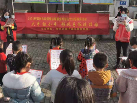 (本网讯)3月4日下午,梁子湖区委宣传部在东沟镇大桥小学开展学雷锋日示范性志愿服务活动,通过开展“大手拉小手 移风易俗进校园”活动,在孩子心中播种“讲文明、树新风”“学雷锋、做好事”的种子。师生共30人参加活动。