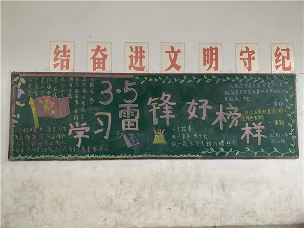 ?各班级针对主题进行认真构思,积极寻找素材,精心设计板报。黑板报内容有的介绍雷锋的生平,有的讴歌雷锋精神,有的宣传雷锋的感人事迹,有的再现雷锋日记,有的宣传“我们身边的雷锋”故事,有的收集雷锋名言录。黑板报形式多样,风格各异,内容积极向上,主题特色鲜明,图文并茂,美观得体,各有特色,充分的发挥了“黑板报”这块阵地的育人作用。