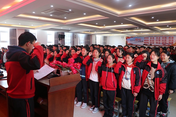 薛雨辰同学带领学生们面对主席台庄严宣誓:“十年磨一剑,只为战中考。志同心相连,我辈必冲天。不负父母的企盼,不负恩师的厚望……”誓言铿锵有力,振奋人心,表达了九年级学生奋战百日,决胜中考,梦圆六月的决心。