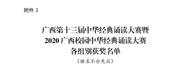 近日,自治区语委、教育厅公布了广西第十三届中华经典诵读大赛暨2020广西校园中华经典诵读大赛获奖名单,我校收获颇丰,荣获“优秀组织奖”。