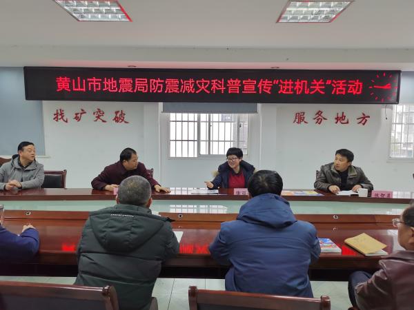 按照黄山市地震局2021年防震减灾科普宣传“七进”计划,3月3日下午,市地震局副局长陶丽娟率队前往安徽省地质矿产勘查局332地质队开展防震减灾科普宣传“进机关”活动。