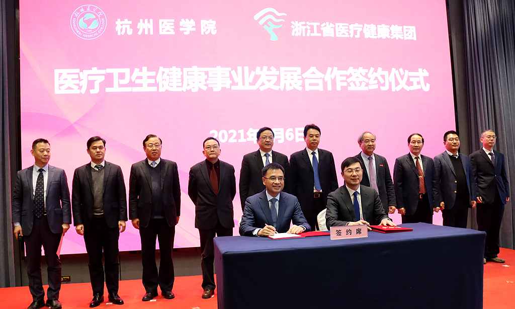 杭州医学院校长、党委副书记黄东胜与浙医健集团党委书记、董事长陈鑫春共同签约。