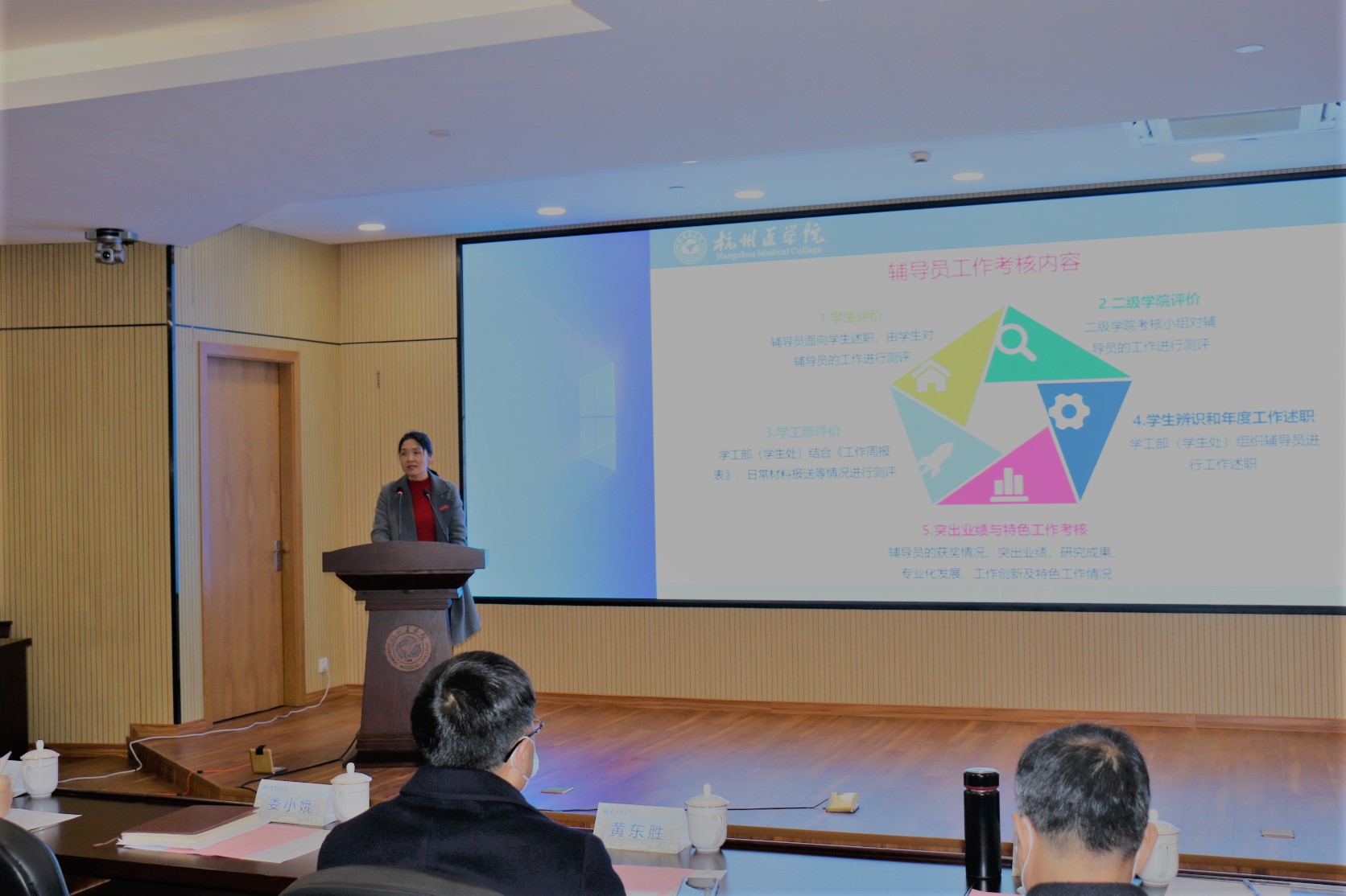 校党委副书记娄小娥全面介绍了我校定量与定性相结合的辅导员考评体系,并从辅导员的双重身份、双重管理以及九大职责表示辅导员在学校中是一种特殊的存在,指出做好辅导员工作需要具备较高的政治素养和坚定的理想信念,较高的演讲能力、文书能力、表达能力,更需要踏实工作,细致工作。希望2021年全体辅导员一如既往地秉持立德树人的初心和使命,以踏石留印、抓铁有痕的决心,以时不我待、只争朝夕的干劲,促进学校学生工作的各项任务落地生根,为推动学校建设成为高水平应用型医科大学作出积极贡献。