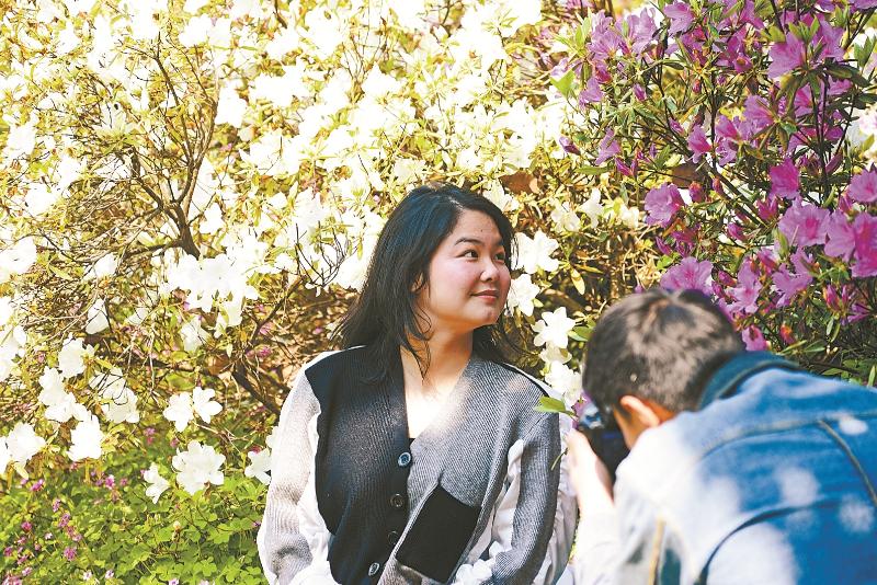 4月6日,市民在马鞍山雨山湖中的明珠——鹃岛上赏花拍照。每年4月初,鹃岛的各种杜鹃争相绽放,姹紫嫣红、异常美丽,香气扑鼻、蜂绕蝶舞。据了解,鹃岛杜鹃“花样繁多”,而且植株较高、花型较大,栽种在景观小品之中,相得益彰。