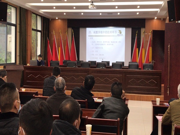 本次培训特邀中国水产科学研究院长江水产研究所、全国水产标准化技术委员会淡养分技委秘书长罗晓松到现场授课,为退捕上岸渔民转产就业进行指导。此次授课围绕稻虾、稻鳖、稻鳅的养殖条件、种苗来源、养殖模式、技术管理、病害防控、发展规划及捕捞等内容进行了深入的讲解。与会人员认真聆听、仔细记录、踊跃提问,氛围浓厚,反响热烈。