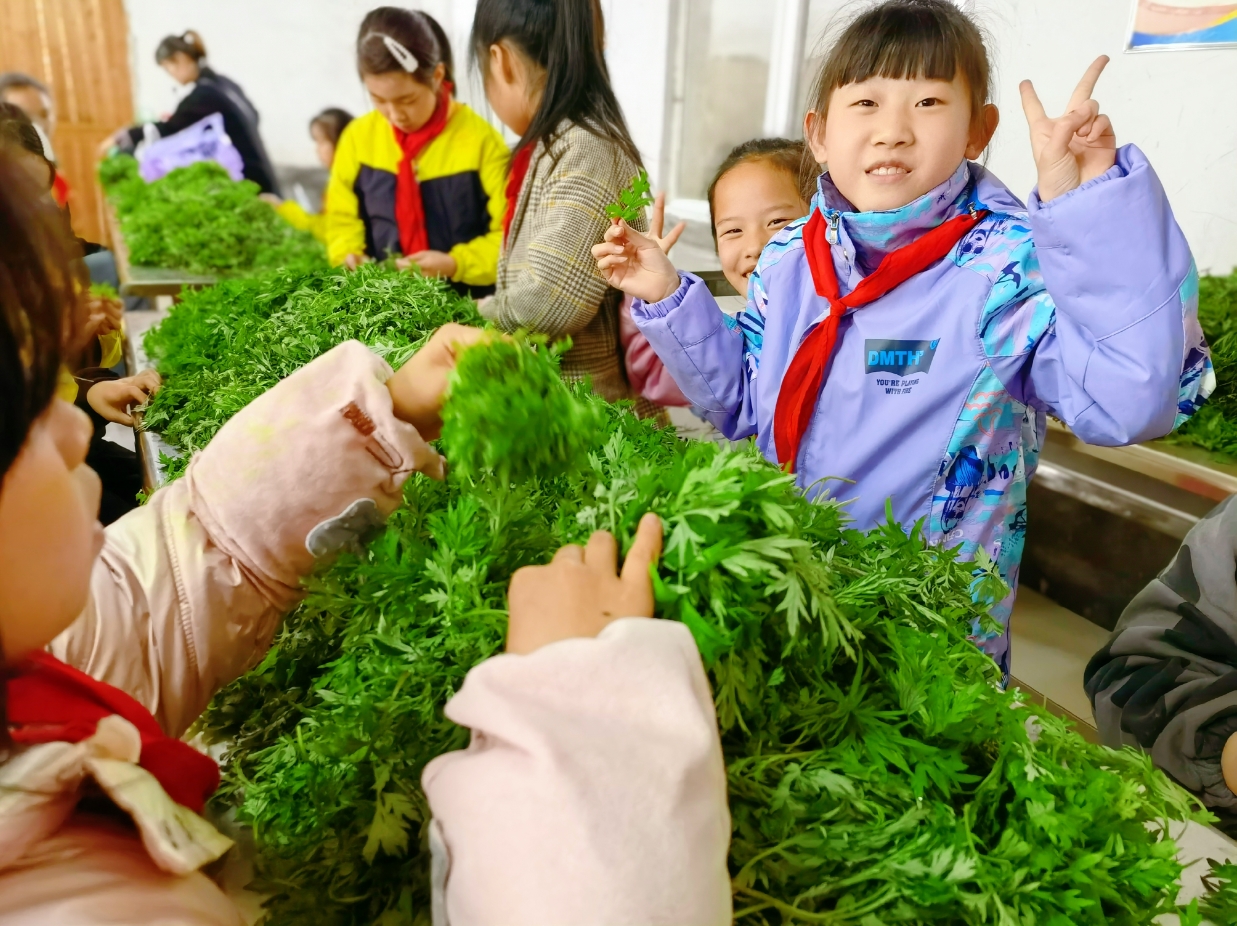 4月6日清晨,甲山学校的孩子们拎着各自在清明节采摘的新鲜蒿叶,一个个满脸兴奋走进了校园,期待着开启今天的校园实践活动——做蒿饼。