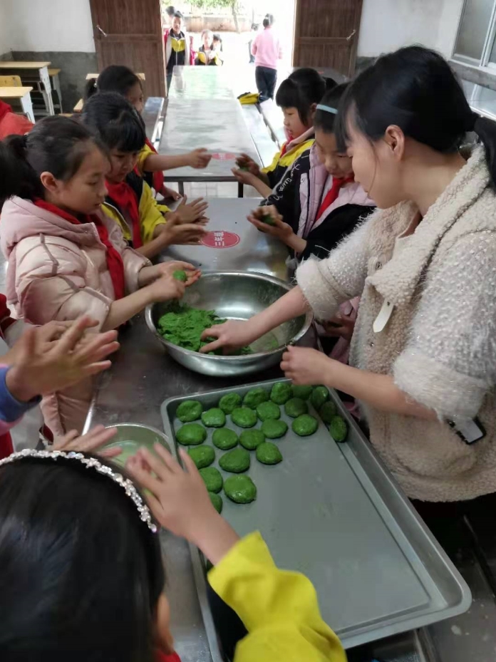为了增进孩子们对清明节传统习俗的认识,清明假日时,各班班主任在班级微信群里动员家长利用假期户外踏青祭祀的机会,带着孩子们提前认识蒿叶,并采摘带来学校制作蒿饼。挑蒿叶,洗蒿叶,燃柴火,烧开水,煮蒿叶,揉面团……制作蒿饼的过程繁琐,在全校师生的分工配合下,大家紧张有序地忙碌着。“水开啦,水开啦!”“这个盆要再加点水,粉有点干。”“这位同学捏出来的面团大小合适!”许多热心家长也自告奋勇加入进来,手把手现场教学,为大家充当技术指导和得力帮手,整个食堂都弥漫着蒿叶清香。