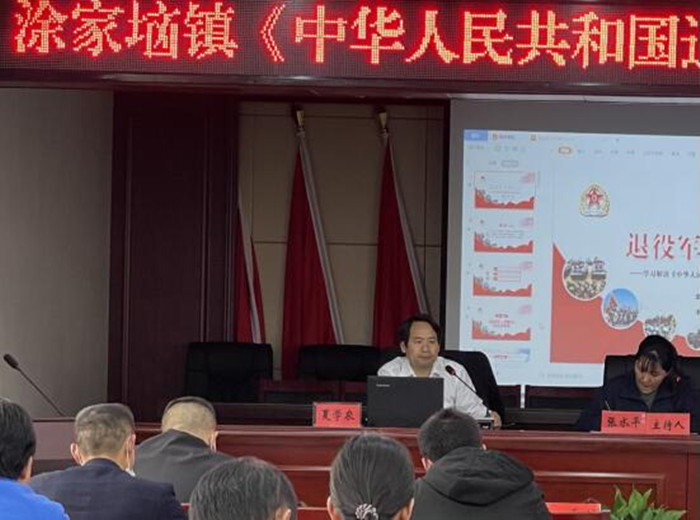 (本网讯)为深入学习贯彻《中华人民共和国退役军人保障法》,为进一步维护退役军人权益,宣传退役军人相关政策。4月22日下午,镇退役军人服务站邀请湖北民福律师事务所夏学农律师到涂家垴镇开展《中华人民共和国退役军人保障法》(下称《退役军人保障法》)宣讲活动,各村退役军人服务站专干参加,活动由镇分管负责人主持。