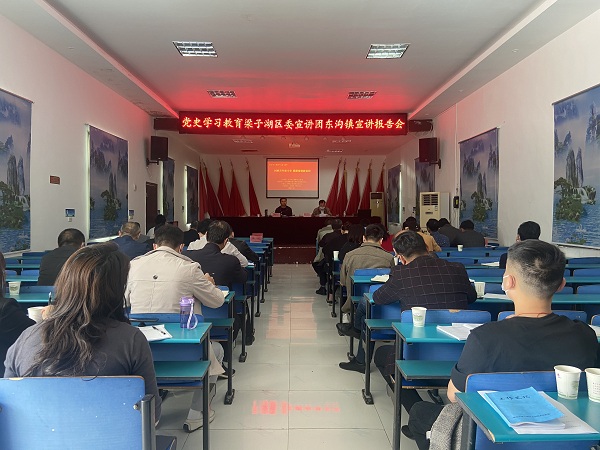 (本网讯)4月28日,东沟镇在一楼会议室举办党史学习教育宣讲会,镇党委书记赵伦泉作题为“回眸百年奋斗史,砥砺奋进新征程”的宣讲,镇党委班子成员、副科级及以上干部,镇直机关、各部门负责人以及各村党支部书记参加会议。