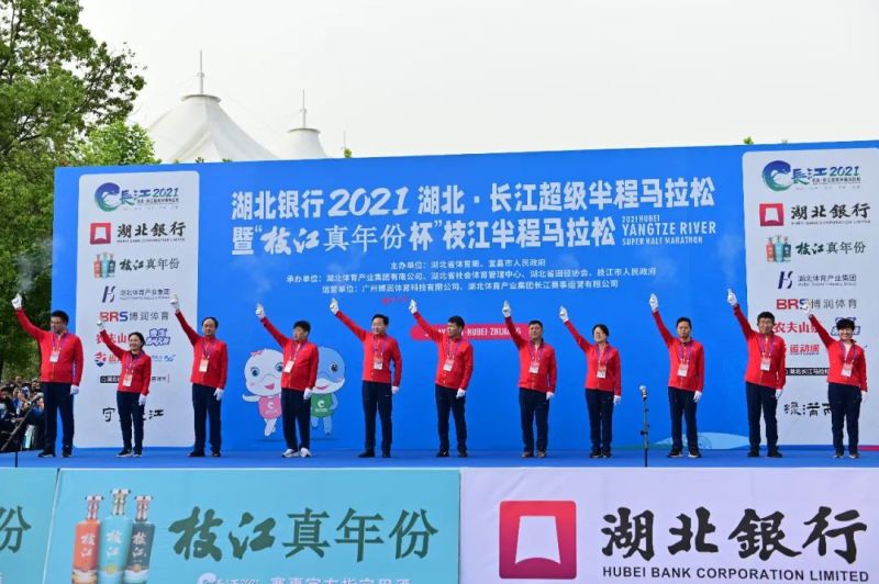 中共枝江市委书记贾立在长马武汉主会场出席鸣枪仪式,湖北体育产业集团有限公司副总经理张少武,宜昌市人民政府副秘书长叶竟涛,宜昌市文化和旅游局副局长郭青芸,中共枝江市委副书记、市长余峰,湖北银行宜昌分行行长助理陶鸣东,中共枝江市委副书记黄芳帅,枝江市人大常委会主任谭从彬,枝江市政协主席方明柱,中共枝江市委常委、市委宣传部部长黄丹梅,枝江市人民政府副市长刘青,湖北枝江酒业股份有限公司副总经理、销售公司总经理张强等领导和嘉宾在枝江站出席起跑仪式。