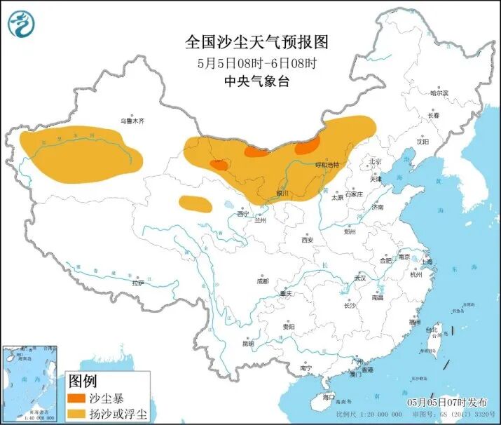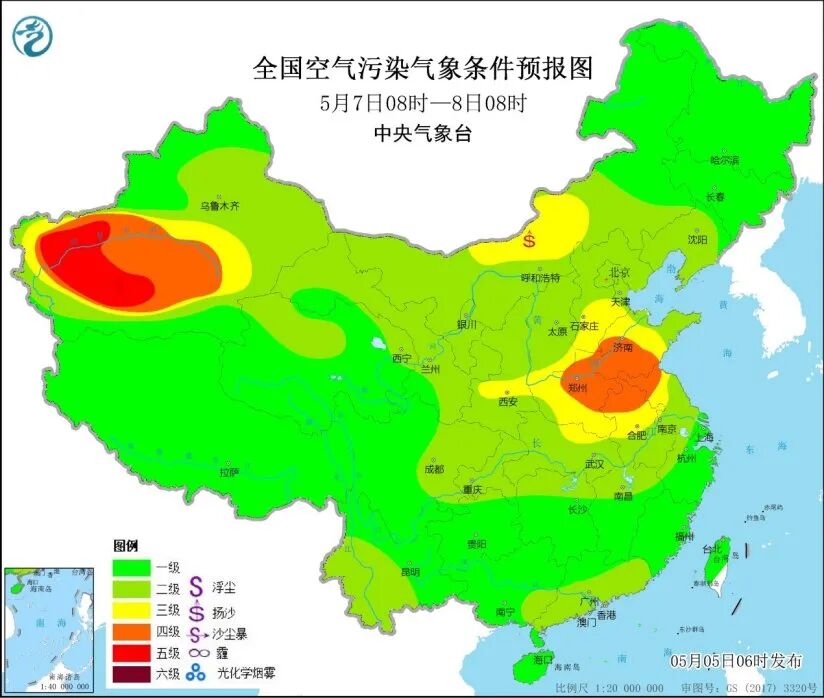 5月7日,沙尘影响减弱,中西部及东部偏南地区受局地扬沙或浮尘影响,空气质量将达到轻度污染。