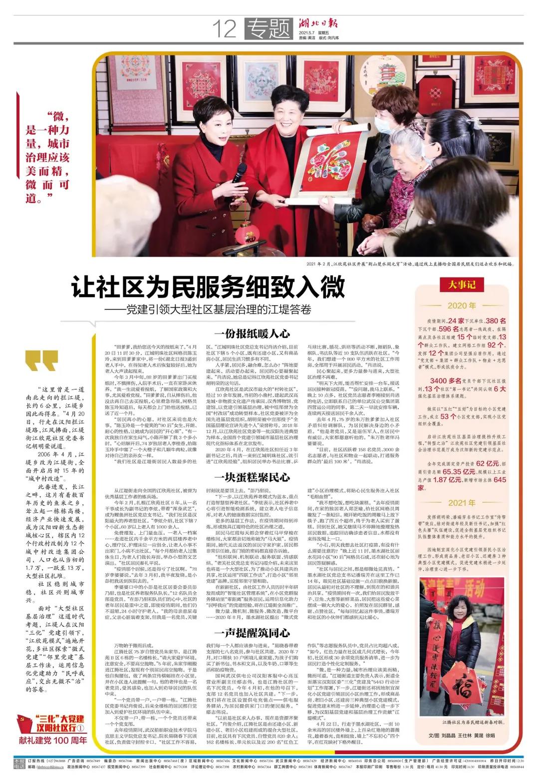 5月7日,《湖北日报》推出“三化大党建 汉阳社区行”开篇《让社区为民服务细致入微——党建引领大型社区基层治理的江堤答卷》一文,聚焦江堤街破题超大社区的微治理之道。