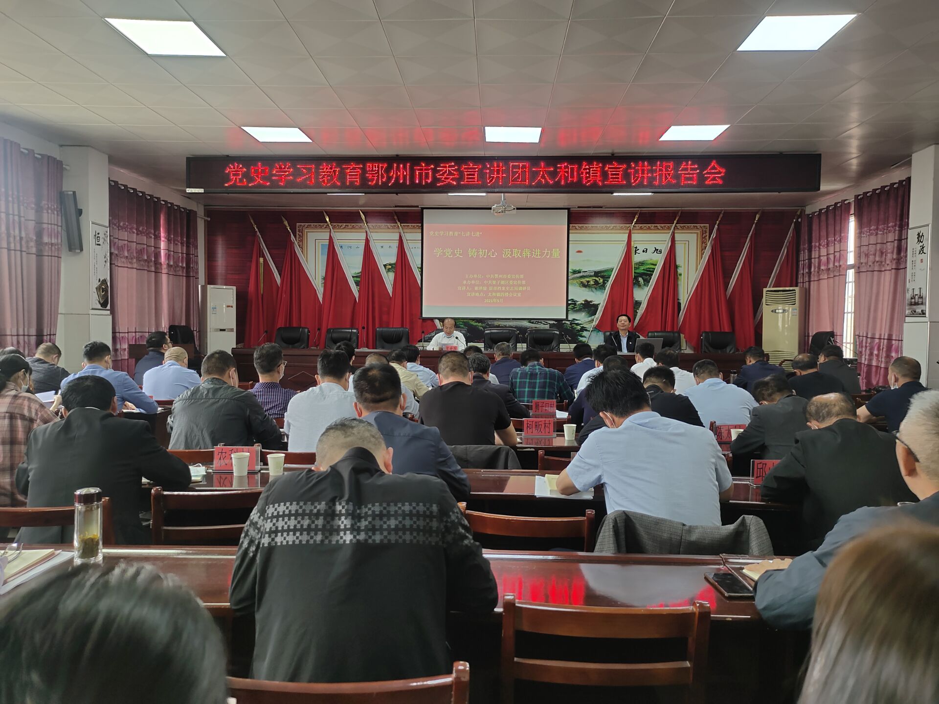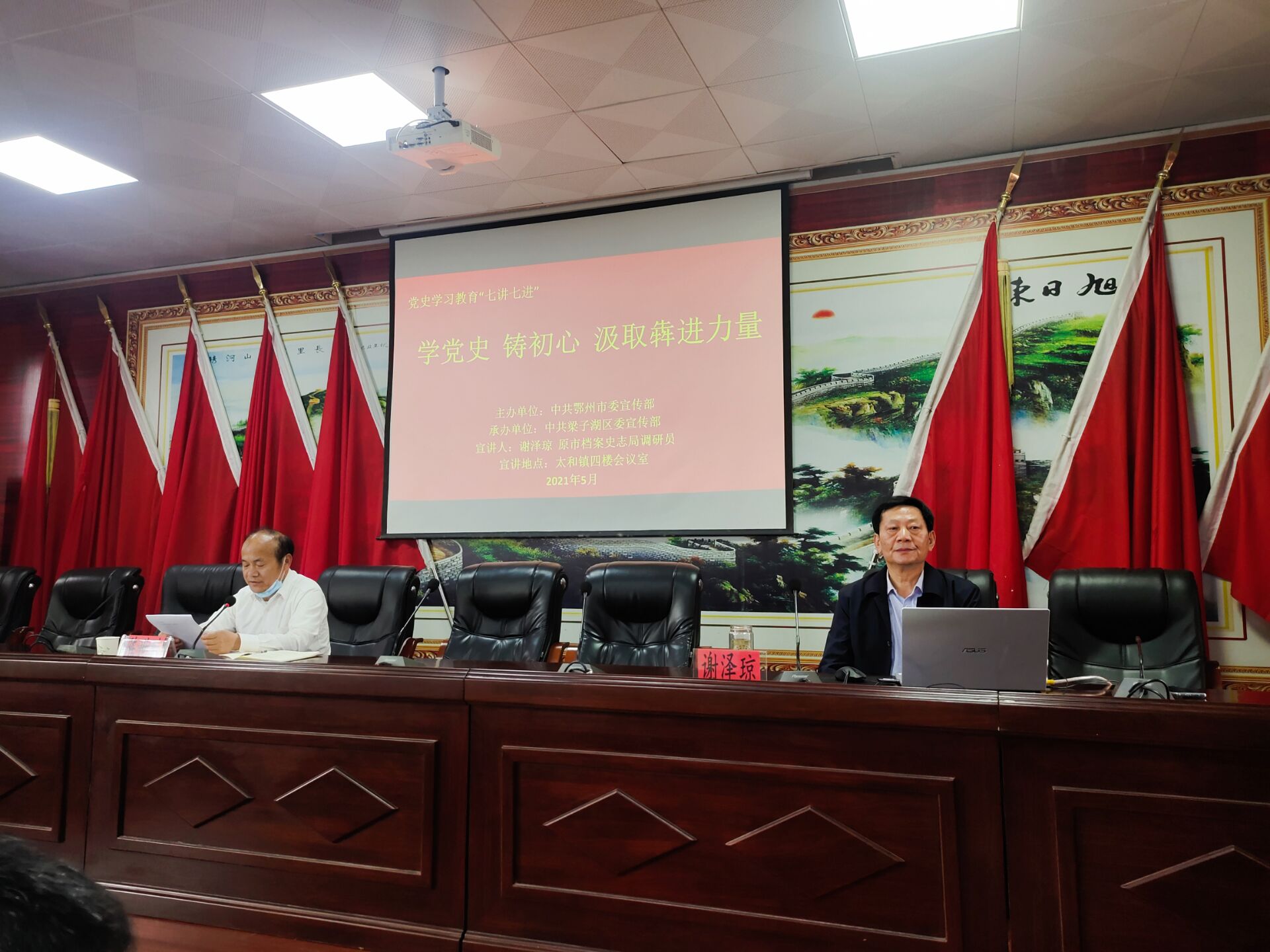 (本网讯)5月20日,党史学习教育宣讲走进太和镇。在太和镇政府四楼会议室,党史学习教育鄂州市委宣讲团成员、原市档案史志居调研员谢泽琼开展党史宣讲。各村(居)党支部书记、镇全体干部参加本次活动。