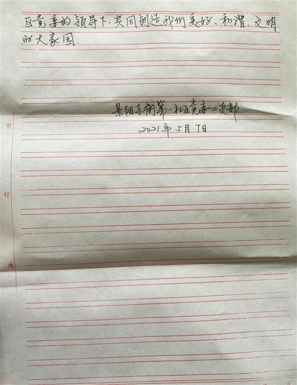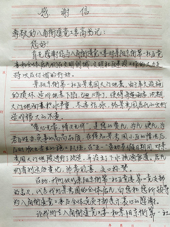 景阳东街第一社区党委第二党支部代表景秀园的全体居民送来了感谢信,向八角街道党工委及景阳东街第一社区党委表示衷心感谢。还有居民送来了自己制作的串珠党旗,这是对八角街道工作的肯定与赞许。八角街道以行动践行初心,以实干担当使命,把党旗亮到了居民的心坎上。