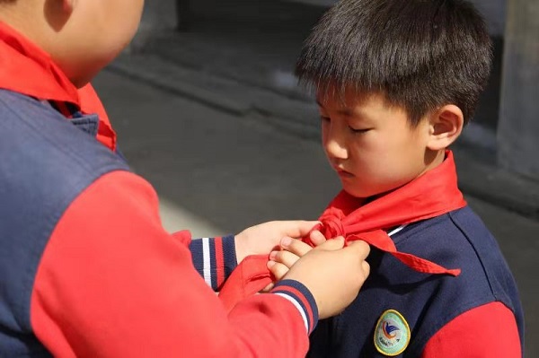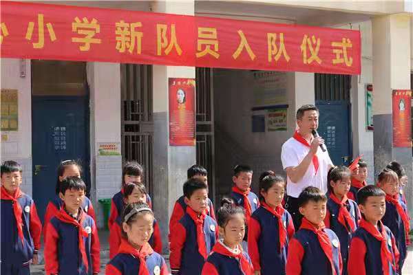 接着,老队员们郑重地为新队员们系上鲜艳的红领巾,新队员个个神采奕奕,与老队员互敬队礼。礼毕之后,在庄严的队旗下,全体新入队的同学们在大队辅导员孟青松的带领下,高举右手,庄严宣誓:“我热爱中国共产党,热爱祖国,热爱人民,好好学习,好好锻炼,准备着为共产主义事业贡献力量”。