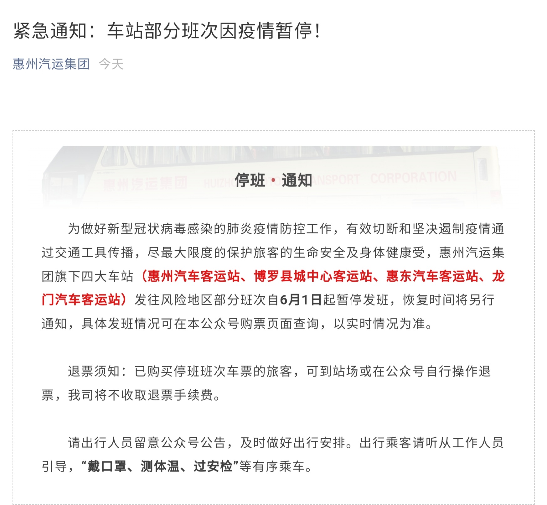 紧急通知!惠州汽运部分班次暂停,已购票的可全额退票