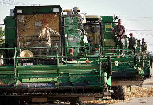 6月6日,在河南省周口市黄泛区农场九分场,农机队伍准备出发前往麦田进行收割作业。