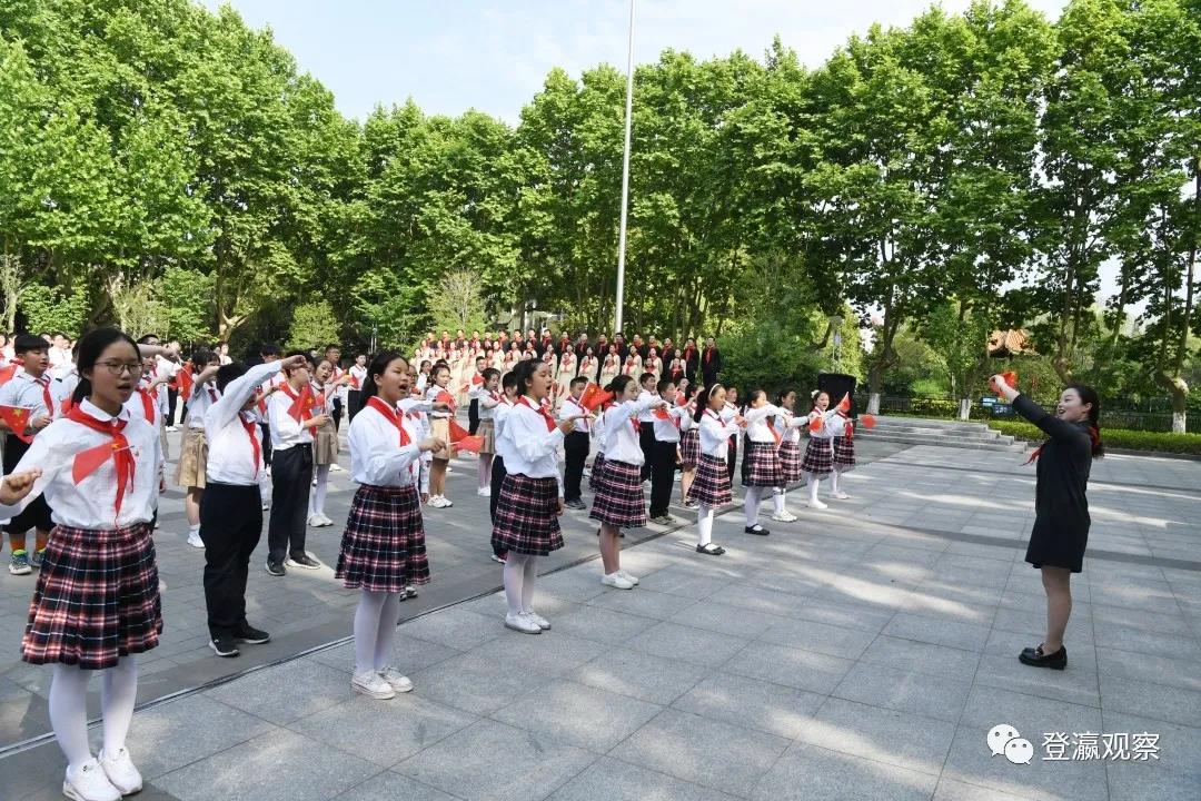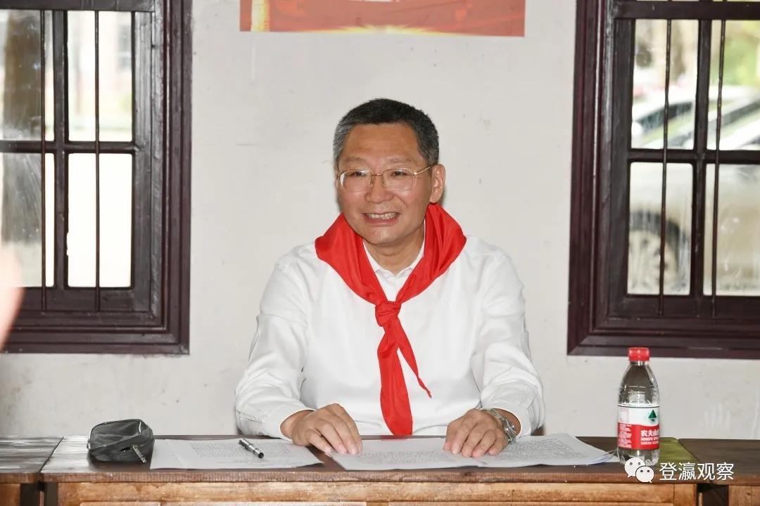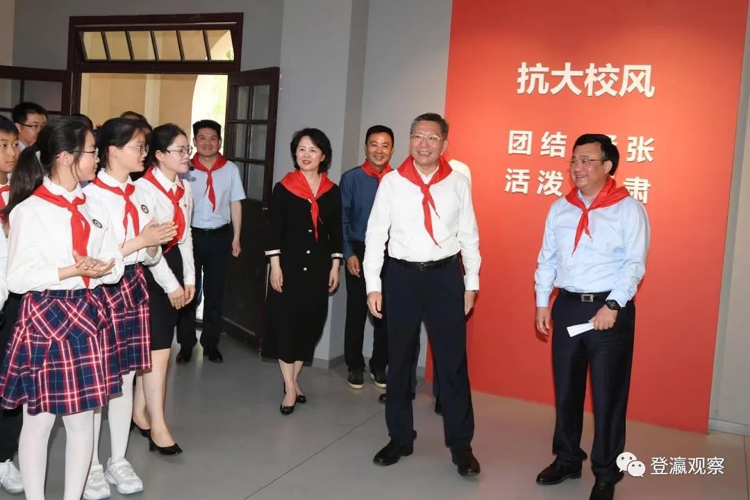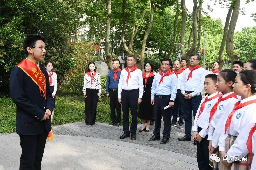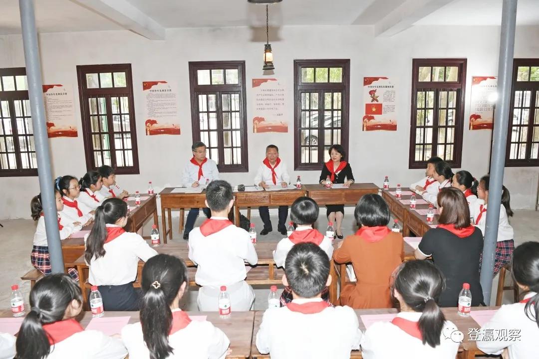 初夏的校园郁郁葱葱、生机勃勃,不时传来的朗朗读书声催人奋进。少先队员为戴源一行系上鲜艳的红领巾,热情欢迎大家观摩他们的党课活动。在少奇广场上,由少先队员代表和红土地教师合唱团演唱的《中国少年先锋队队歌》《没有共产党就没有新中国》等歌曲,歌声嘹亮、整齐划一。在正北楼,“铁军小讲解员”们声情并茂的向小学少先队员代表介绍抗大五分校历史,荡气回肠间激发少先队员们内心深处爱党爱国爱家的热烈情怀。戴源认真观摩、仔细聆听,对全市少年儿童的坚定理想和蓬勃朝气表示赞许。