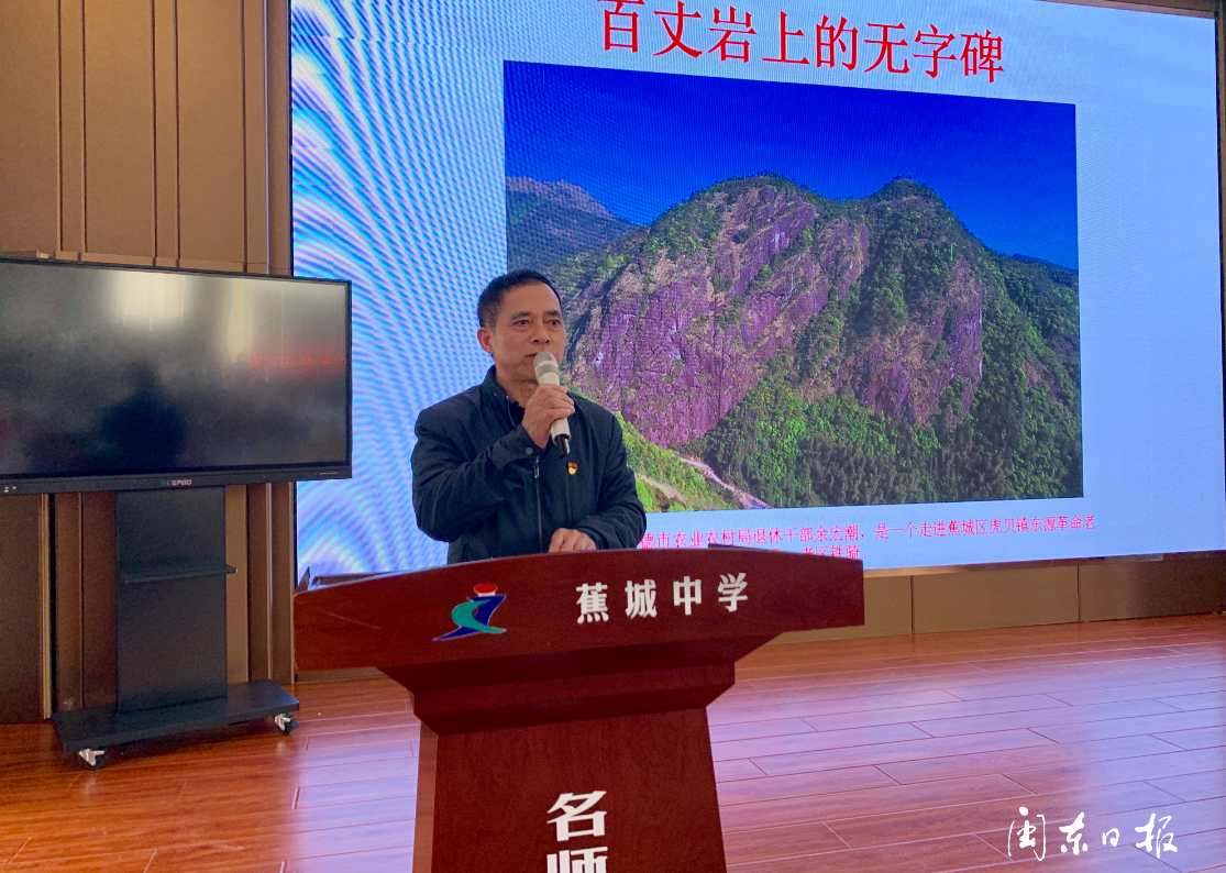 由市委老干部局主办的第5期老干部讲坛走进蕉城区虎贝镇东源村,退休干部余宏潮作题为《百丈岩上的无字碑》宣讲。
