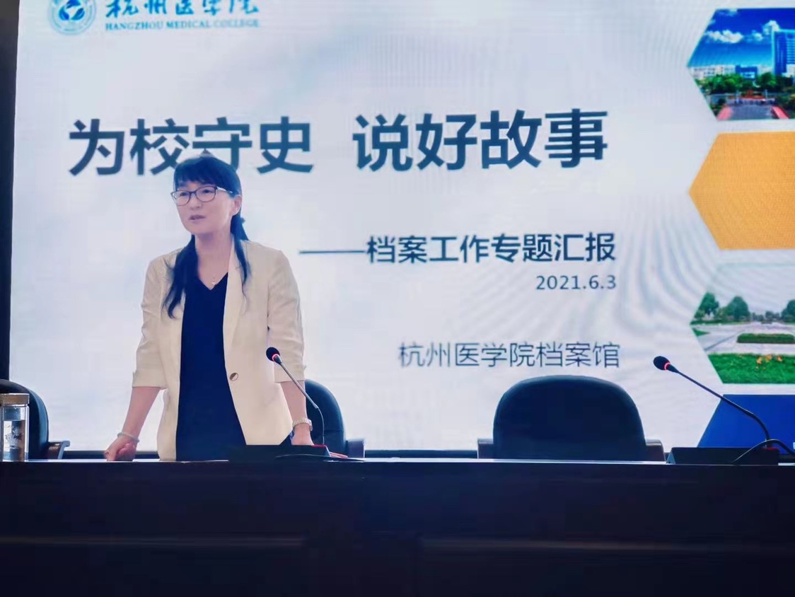 档案馆馆长郑磊以《为校守史,说好故事》为题做档案工作专题汇报。她表示此次会议旨在强调档案工作的重要性,提高各兼职档案员“为党管档,为校守史”的档案意识和强化各部门的档案责任,做好“十四五”开局之年全校档案工作,讲好杭医故事,提高档案服务师生和学校改革发展的能力。