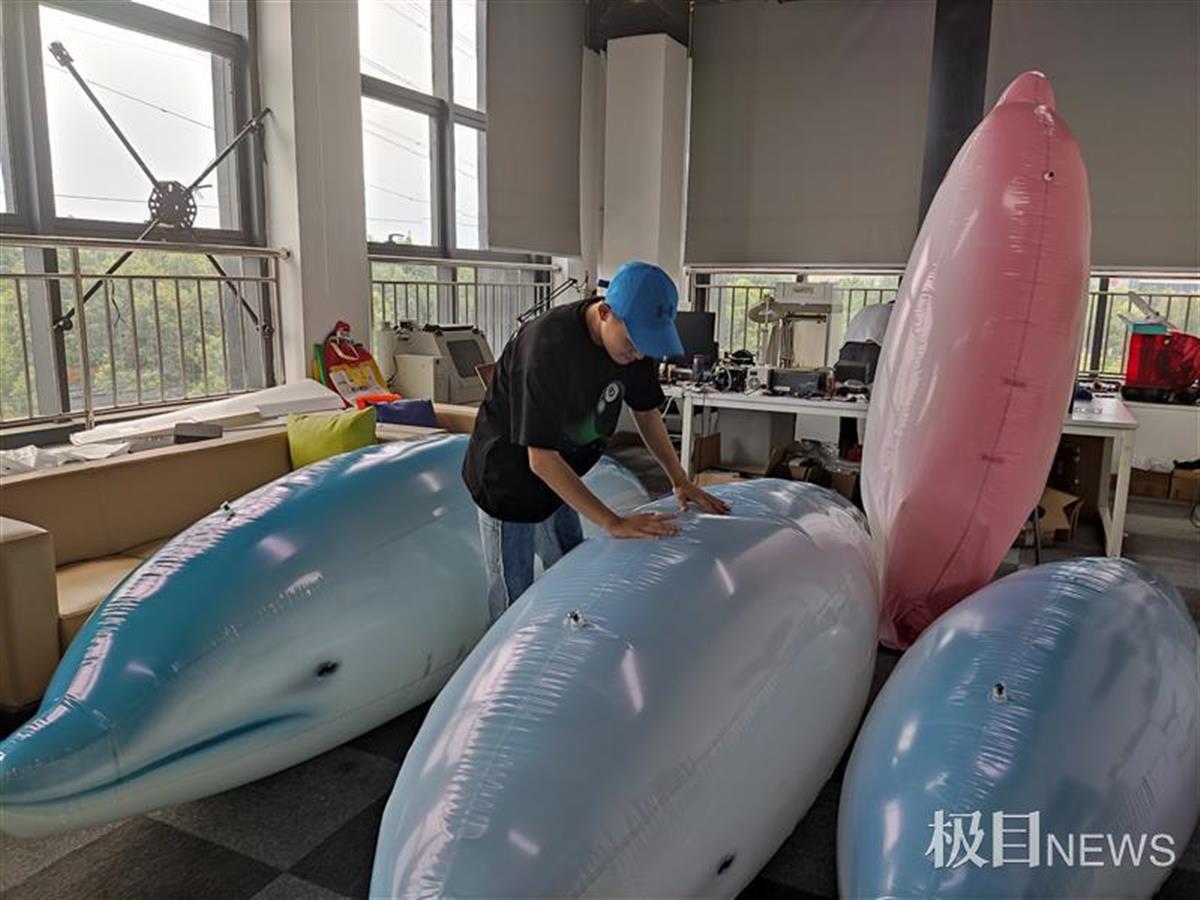 走进大秀智控办公区,悬挂在空中的海豚模型映入眼帘,周围摆放的是各类工业无人机,而在另一间办公室内,近三米长的多个海豚模型平躺在地上,“我们过两天就要交一批货,所以这两天特别忙。”公司创始人张珩对极目新闻记者说道。记者在现场看到除了模型和无人机,还有一台3D打印机正在运转,“这台打印机打印出来的就是‘鲸鱼’、‘海豚’身上的零件。”张珩神秘地说道,原来3D打印机打印出的零件起到支撑和造型的作用。