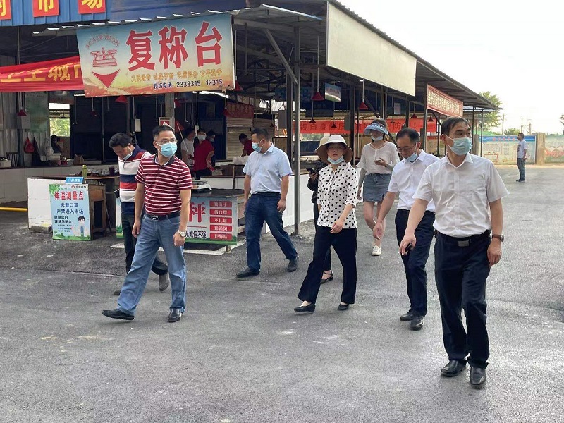 6月7日下午,副市长程少云,区长董国平一行到我镇调研创卫复审工作,到泽林集贸市场实地查看有关情况,镇党委书记张维华,镇长汪招鹏陪同检查。