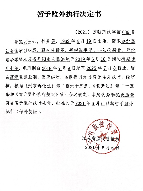 暂予监外执行决定书(2021)苏狱刑执字第039号