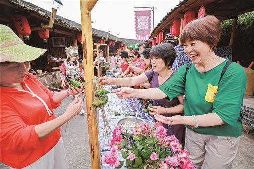 上图:6月12日,麻阳苗族自治县隆家堡乡步云坪村霞飞云果园,游客在体验包粽子民俗,感受传统文化的魅力。 滕树明 摄