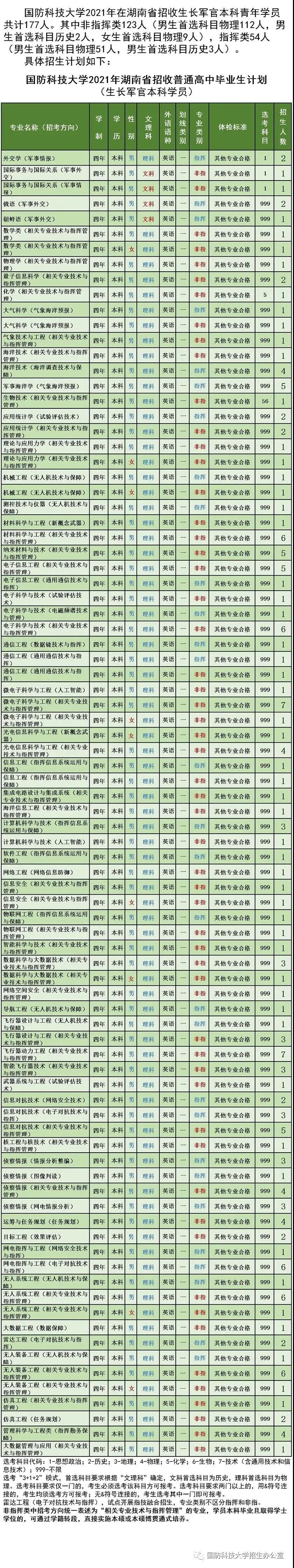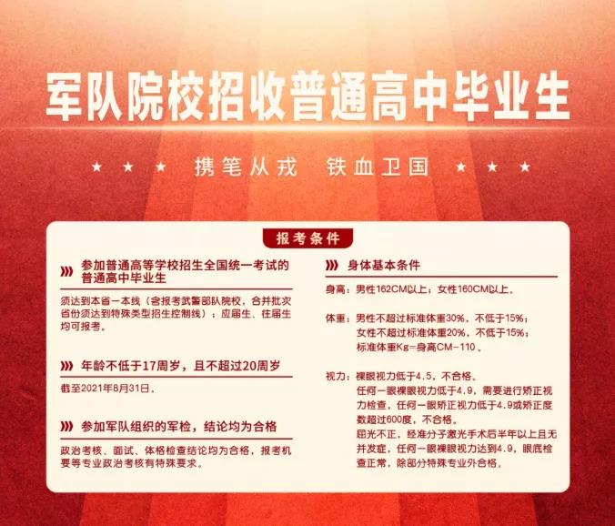 湖南高考生 2021年军校招生计划新鲜出炉 27所军校在湘计划招收746人 报考军校有哪些条件? 听说学费全免?毕业包分配? 女生可以报考吗? 对身高、视力有什么要求? 速看 2021年27所军队院校在湘计划招收普通高中毕业生746人,其中男生701人(物理类688人、历史类13人)、女生45人(物理类44人、历史类1人)。 国防科技大学在湘招生最多,招177人;其次是空军工程大学,招78人;海军工程大学招49人,排第三。 考生报考军校须满足年龄、身体等方面规定条件,特殊专业还有相应具体要求。今年报考条件有2个变化:一是报考所有军队院校均须达到本省一本线(合并录取批次省份须达到特殊类型招生控制线);二是考生高中阶段体质测试成绩须达到及格以上。 军校报考流程主要分政治考核、填报志愿、面试体检、投档录取、入学报到五步。 政治考核就是我们常说的“政审”,考察的是考生本人及家庭成员的现实政治表现,考核内容主要包括:考生的个人基本信息、政治面貌、宗教信仰、婚姻状况、毕业学校、主要经历、出国(境)情况、现实表现、奖惩情况,以及家庭成员、主要社会关系成员的政治情况等。政治考核合格的考生才有资格参加接下来的面试和体格检查。 高考分数公布后,考生按照本省规定的志愿批次,自愿填报军队院校志愿。军队院校招生一般安排在提前批进行,先于后续批次的地方普通高校录取。因此,报考军队院校未被录取者不影响后续批次院校的录取。 需要提醒的是,常态化疫情防控下,体格检查前考生要做好自我健康监测,确保体检时身体状况良好;考生及其共同居住者要减少外出,避免走亲访友、聚餐。考生应当关注本省体格检查工作相关安排,体检途中做好个人防护,全程佩戴口罩,准备好手套、消毒纸巾等防护物品。 和地方高校相比,军校学员享受供给制待遇,没有任何经济负担。换句话说,就是全免费。军校学员上学不仅不交费,每月还能领取津贴。 以国防科技大学为例,学校录取的军人本科学员,经复查合格后,按有关规定办理入伍手续,即为现役军人。学习期间着陆军学员制服,享受部队供给制待遇。学习、生活费用均由军队承担,每月另发给1150元-1450元津贴。 军校学员只要考试考核合格,全部面向全军统一分配。 以国防科技大学为例,首先对每名毕业学员进行综合评定,依据学员全程课程考核、综合素质考核和平时综合表现等情况,进行量化加权计算。学员综合评定作为确定分配工作单位的基本依据。毕业学员依据综合评定排名顺序,在本专业分配计划明确的分配单位范围内,依次提出个人分配志愿。分配政策制度、学员综合评定结果、分配计划方案等进行全程公开公示。 此外,军校学生毕业将授予军衔。本科毕业,通常授予少尉,待遇级别定为十八级。研究生毕业,取得硕士学位的授予中尉,待遇级别定为十七级;取得博士学位的授予上尉,待遇级别定为十五级。 有人认为,只要被军校录取,自己的军校生活就后顾无忧了,这可是一个误解。军校实行的是严进严出的政策,有一定的淘汰率。 以国防科技大学为例,学校学员实行全程淘汰。入学三个月内,复查复试不合格未取得学籍的新学员退回入学前常住户口所在地。在取得学籍后的本科学习期间,因学习成绩和身体心理条件不合格被退学的学员退回入学前常住户口所在地,服役期两年以内(含两年)的参照义务兵退伍、两年以上的参照士官复员或退役的有关规定办理。因身体、心理等方面不能适应军校学习生活和将来不适合从事军队岗位工作,但符合普通高等学校入学条件的青年学生学员,除毕业年级以外,可转入指定的军校所在驻地普通高等学校学习。毕业前,学校对学员进行综合素质考核,考核合格的准予毕业,军事指挥类学员还将进行军事基础素质综合考核,不合格者予以淘汰。