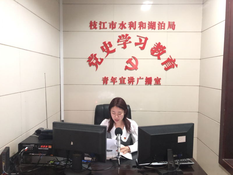枝江融媒(通讯员 李书英)“大家好!我是水利和湖泊局党史学习教育青年宣讲队的宣讲成员王美化,今天由我和大家一起来学习《中共共产党简史》的第七章第三节内容——农村改革、创办经济特区和改革开放的起步……”在水利和湖泊局党史宣讲广播室,青年干部王美化正在通过广播播报。开展党史学习教育以来,枝江市水利和湖泊局新建党史学习教育青年宣讲广播室,利用喇叭每天分早、中、晚三个时段定时播报党史,营造浓厚的党史学习教育氛围。