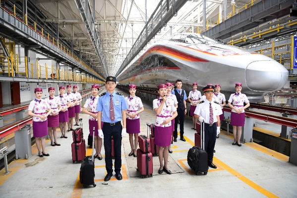 6月23日,CR400AF复兴号智能动车组及乘务组在重庆车辆段西动车所亮相。 当日,CR400AF复兴号智能动车组在中国铁路成都局集团有限公司重庆车辆段西动车所正式亮相,该动车组将于6月25日投入成渝城际铁路运营。据了解,具有完全自主知识产权的复兴号智能动车组2019年12月率先在京张高铁投用,6月25日,复兴号智能动车组将扩大至京沪、京广、京哈、徐兰及成渝高铁开行。 新华社记者 唐奕 摄?