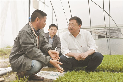 2013年5月,蒙汉(右一)在溆浦县桥江镇新坪村了解水稻集中育秧情况。通讯员 摄