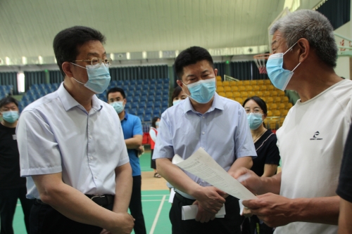 在体育馆临时接种点,王金栋详细询问新冠疫苗接种人数、接种情况及服务保障等情况,并对周末、节假日坚守岗位的工作人员表示亲切慰问。