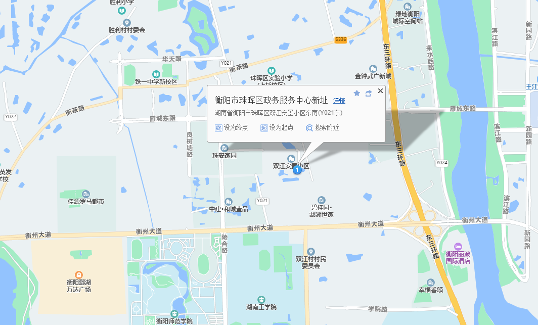 新政务中心大厅位于双江安置小区(珠晖区人民法院旁),到区法院路口有路牌指示,地图如下: