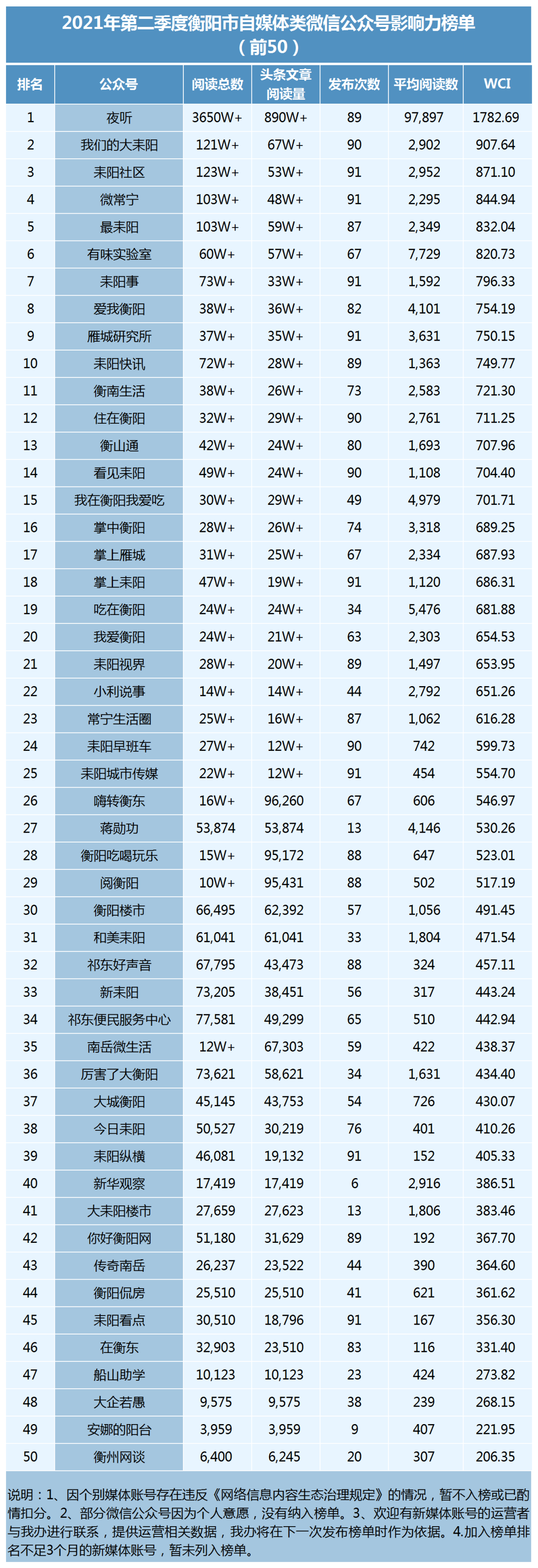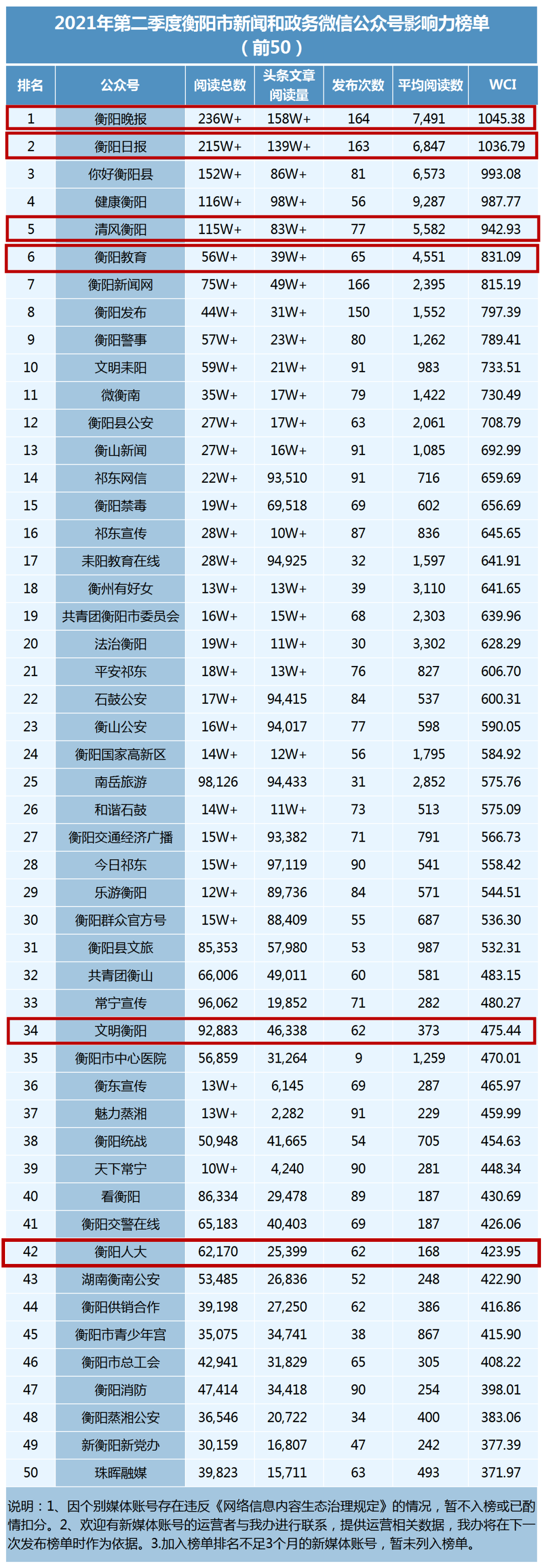 · 二季度衡阳新媒体影响力榜单出炉,衡阳日报社官方微信公众号包揽前二